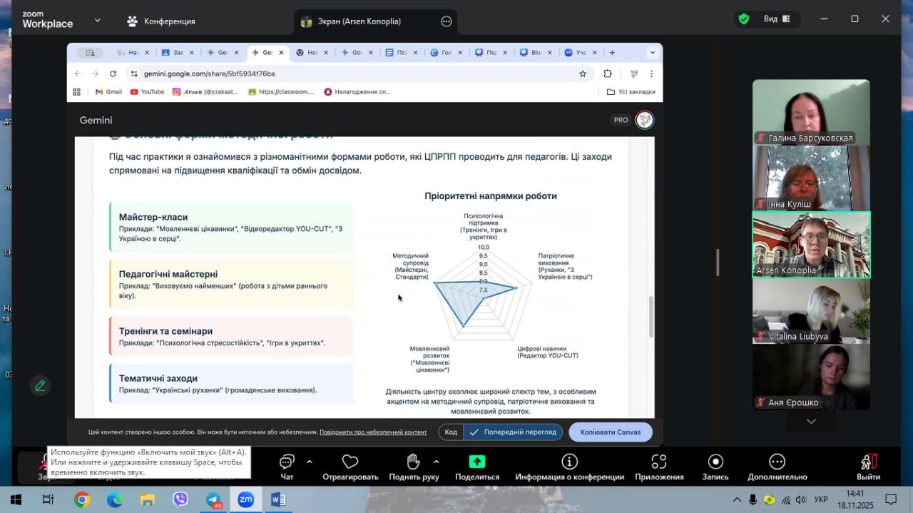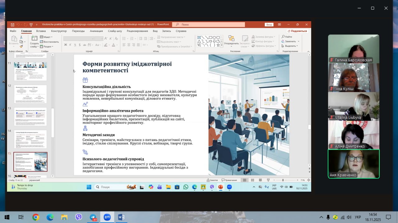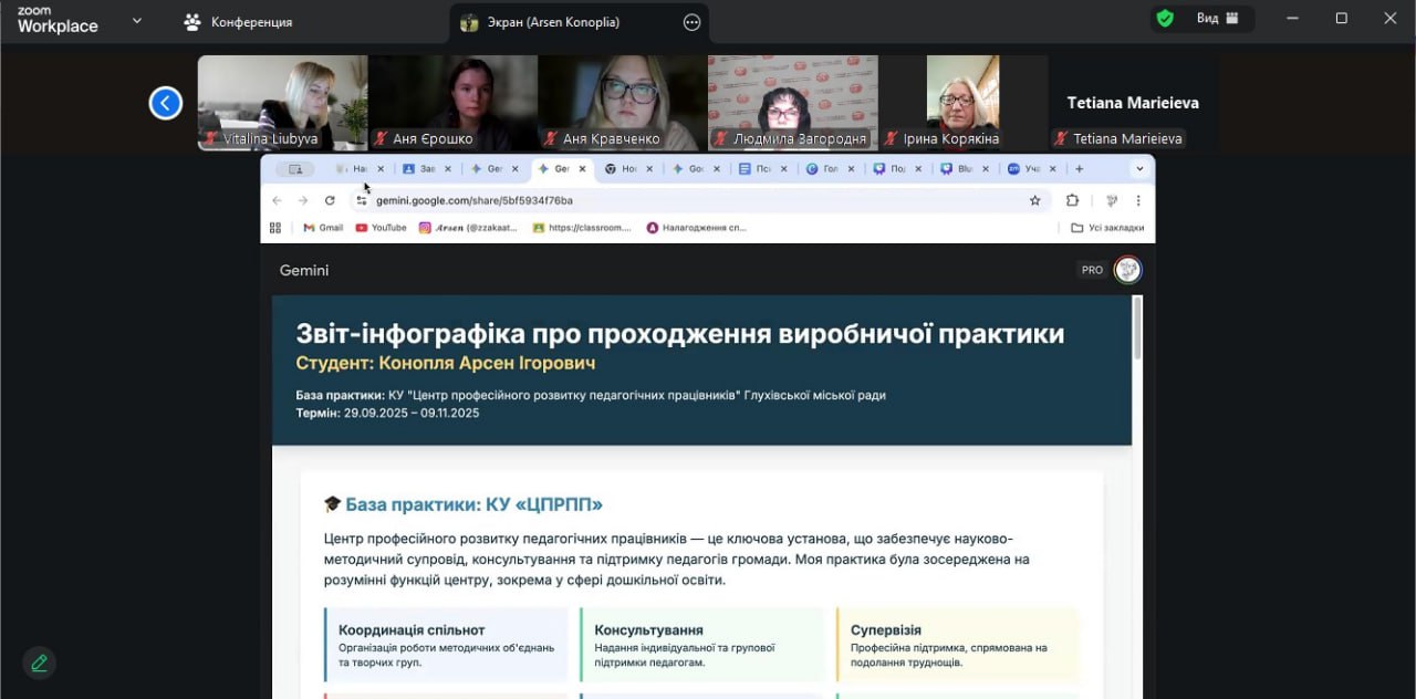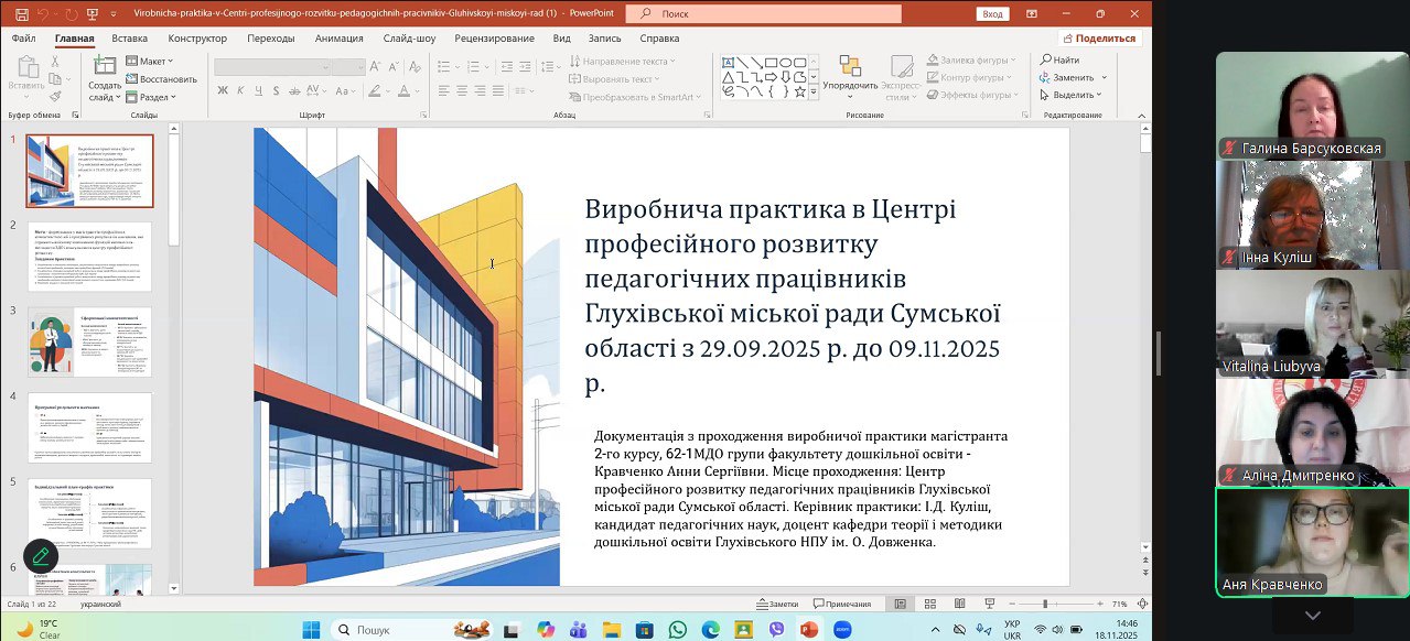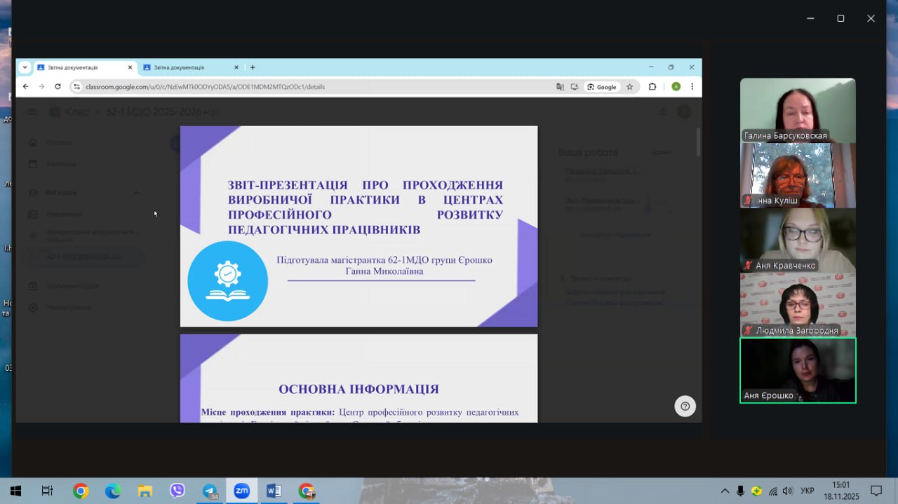 Магістри 62-1МДО групи справили позитивне враження завдяки змістовним мультимедійним презентаціям, використанню сучасних методів подання результатів Вони продемонстрували власне бачення виконання практичних завдань, підтвердили високий рівень теоретико-методичної підготовки до реалізації професійних умінь, виявили сумлінність і творчий підхід у виконанні завдань, визначених на період практики, а також поділилися труднощами, що виникали під час освітньої діяльності.