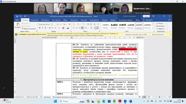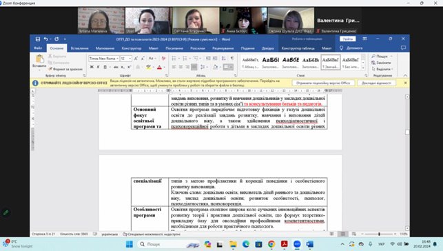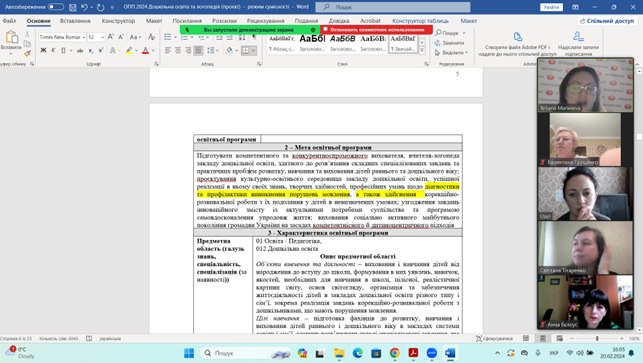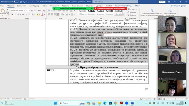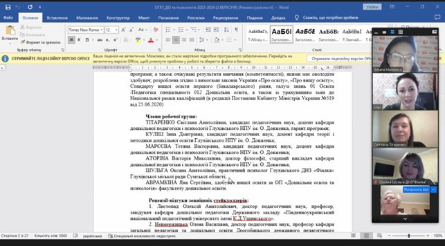 20 лютого 2024 року було проведено спільну зустріч робочих груп із розроблення проєктів ОПП «Дошкільна освіта та логопедія» (гарант к.п.н., доц. Тетяна Марєєва) і «Дошкільна освіта та психологія» (гарант к.п.н., доц. Світлана Тітаренко) для першого (бакалаврського) рівня вищої освіти. До обговорення проєктів освітніх програм долучилися Марія Кириченко, консультант, вчитель-дефектолог Комунальної установи «Інклюзивно-ресурсний центр» Глухівської міської ради Сумської області, асистент кафедри дошкільної педагогіки і психології Глухівського НПУ імені Олександра Довженка, Оксана Шульга, практичний психолог Глухівського ДНЗ (ясла-садок) «Фіалка», Ганна Бєлоус, випускниця за ОПП «Дошкільна освіта та психологія», практичний психолог Конотопського ДНЗ (ясла-садок) №12 «Райдужний», Валентина Гриценко, здобувач освіти за ОПП «Дошкільна освіта та логопедія», вчитель-логопед ДНЗ №8 «Дзвіночок» м. Ромни.