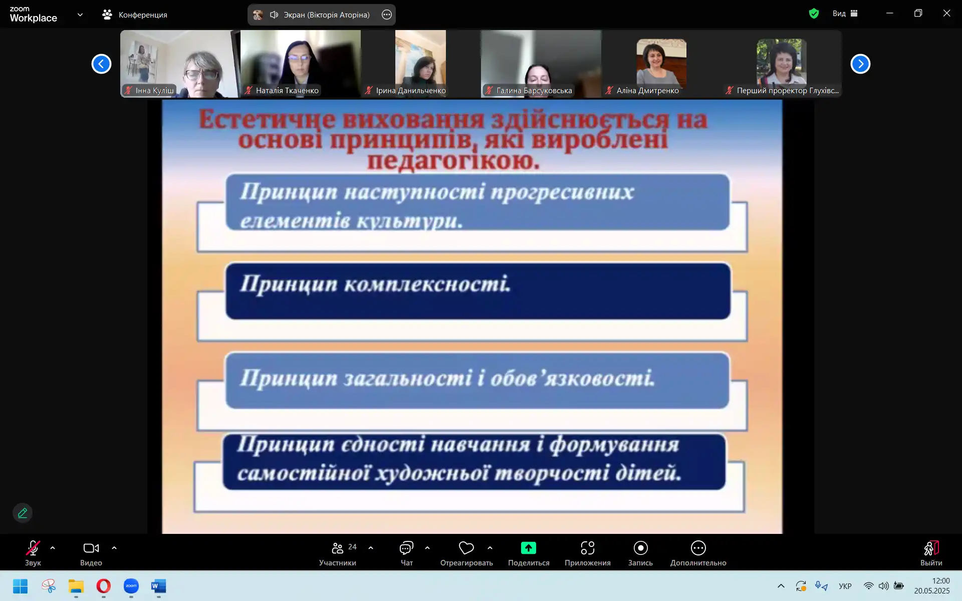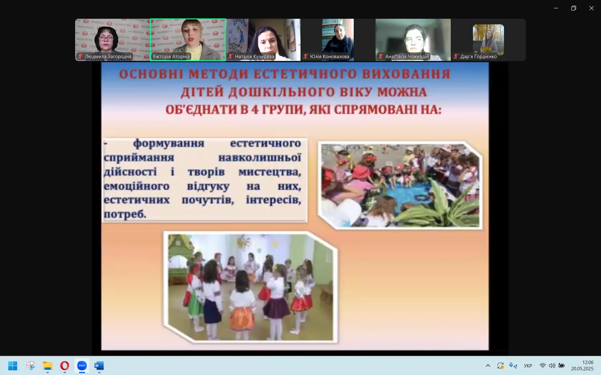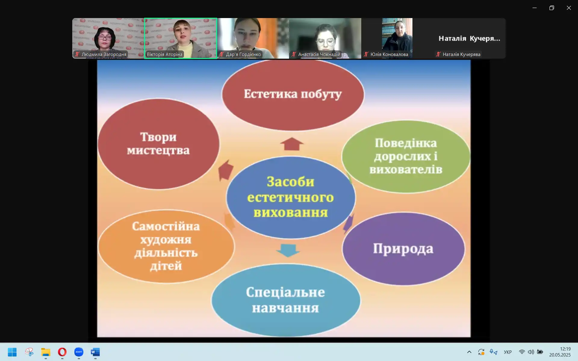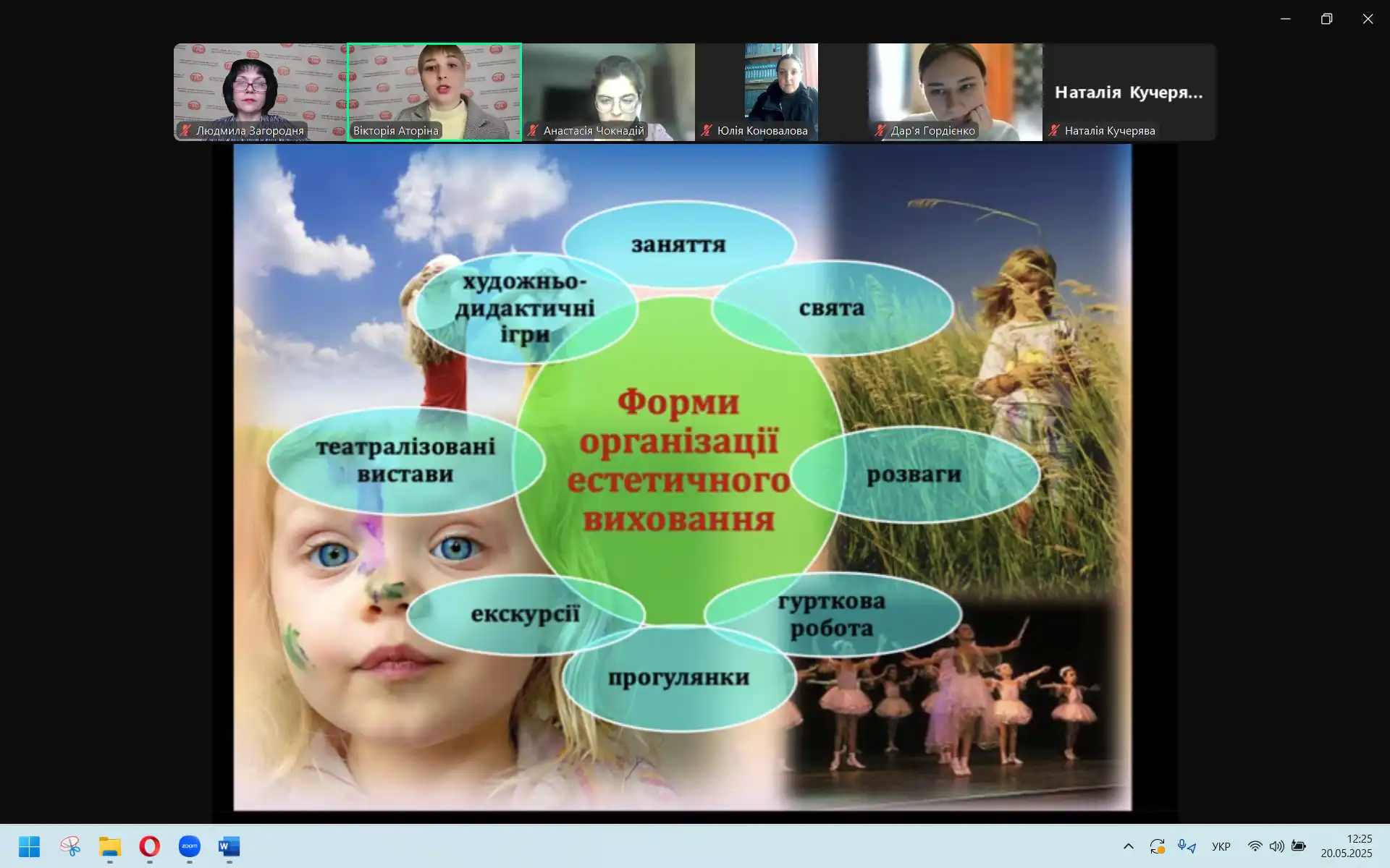 20 травня 2025 року об 11:20 відбулася відкрита лекція доктора філософії, старшого викладача кафедри дошкільної педагогіки і психології Аторіної Вікторії Миколаївни з навчальної дисципліни «Педагогіка дошкільна» на тему «Естетичне виховання дітей дошкільного віку». Під час лекції було висвітлено важливі аспекти формування мистецько-творчої компетентності дитини дошкільного віку, розглянуто завдання, зміст та особливості естетичного виховання дітей різних вікових груп.