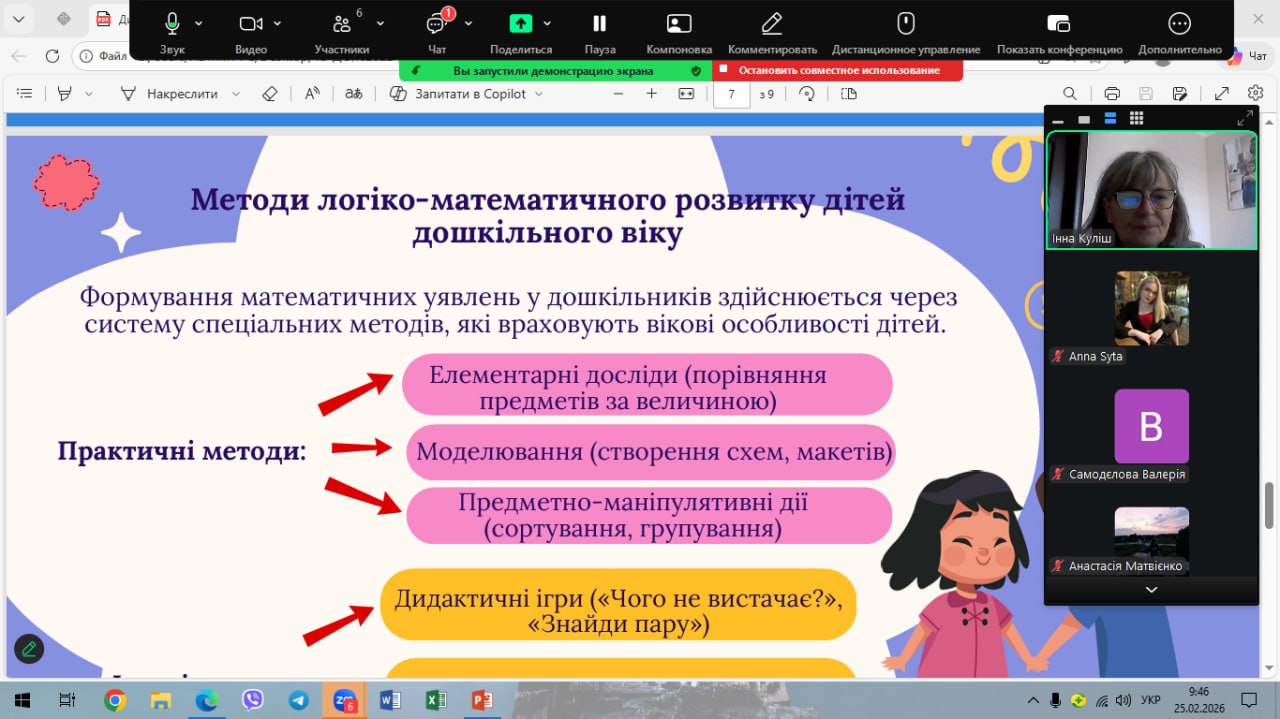 25.02.2026 року на кафедрі теорії і методики дошкільної освіти відповідно до плану роботи наукового гуртка «Математичний дивограй» (науковий керівник доц. Куліш І.Д.) було проведено заплановане засідання наукового гуртка на тему «Логіко-математичний розвиток дошкільників. Впроваджуємо новітні методи і технології». Сплановано роботу над тезами виступів здобувачів освіти до щорічної науково-практичної конференції викладачів, докторантів, аспірантів та молодих учених, здобувачів вищої та фахової передвищої освіти «Освіта і наука XXI століття».