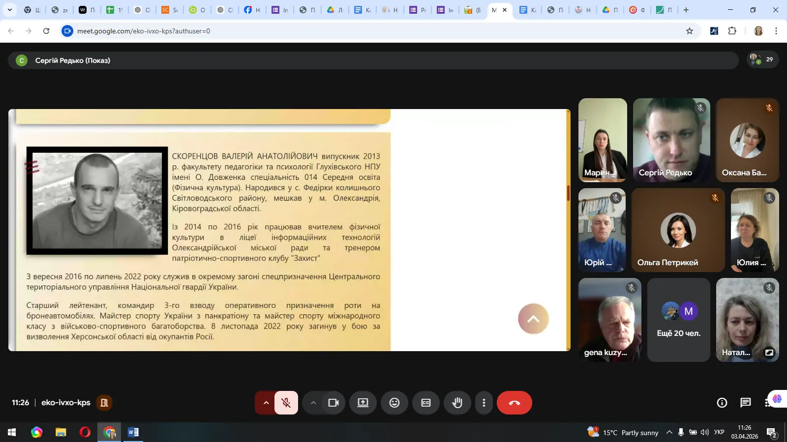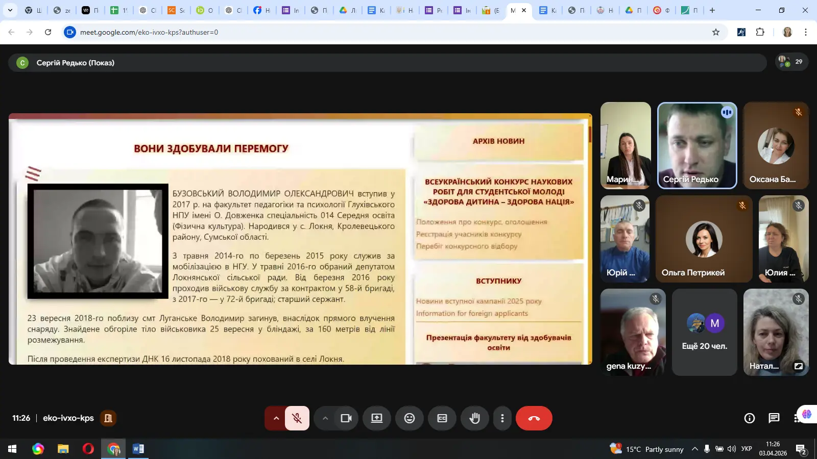 03.04.2026 року в межах проєкту "Пишаємося випускниками" кафедрою теорії і методики фізичного виховання було проведено онлайн-зустріч з викладачем циклу професійно прикладних дисциплін у ВСП " Олімпійський фаховий коледж імені Івана Піддубного НУФВСУ", інструктором спортивного клубу "Judo Master" Мариною Зосиною, випускницею спеціальності А4 Середня освіта (Фізична культура). Спікер онлайн-зустрічі - старший викладач кафедри теорії і методики фізичного виховання Редько С.Ю.