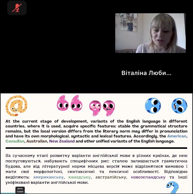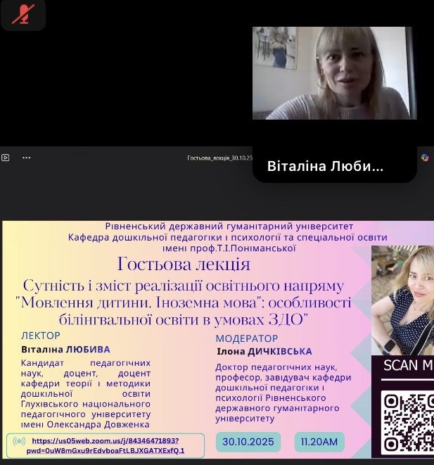 30.10.2025року відбулася гостьова лекція канд. пед. наук, доцента кафедри теорії і методики дошкільної освіти Глухівського НПУ ім. О.Довженка Любивої В.В. на тему "Мовлення дитини. Іноземна мова": особливості білінгвальної освіти в умовах ЗДО»